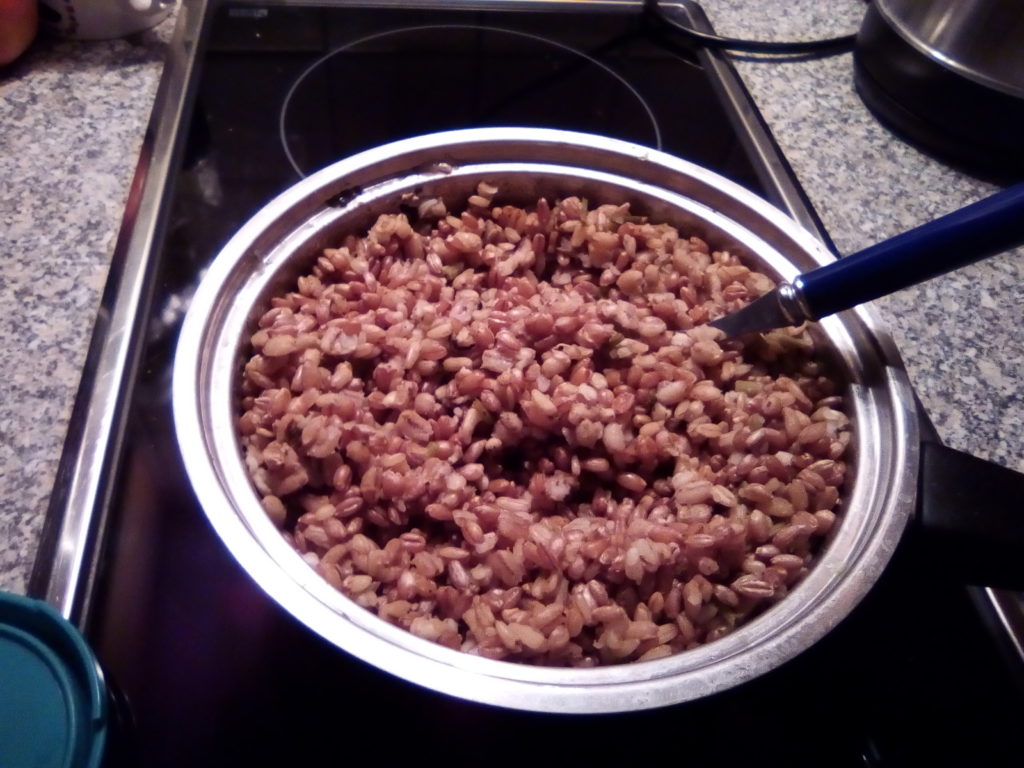 Das ganze Kocht man dann auf kleiner Stufe ca. eine Dreiviertel Stunde bis Stunde. Ggf. muss noch etwas Wasser nachgegeben werden. Die Kürner quellen und platzen zum Teil auf. Das sollen sie, denn sonst kaut man sehr lange oder schluckt zu viele ungeöffnete Körner herunter die einfach nur durchwandern.